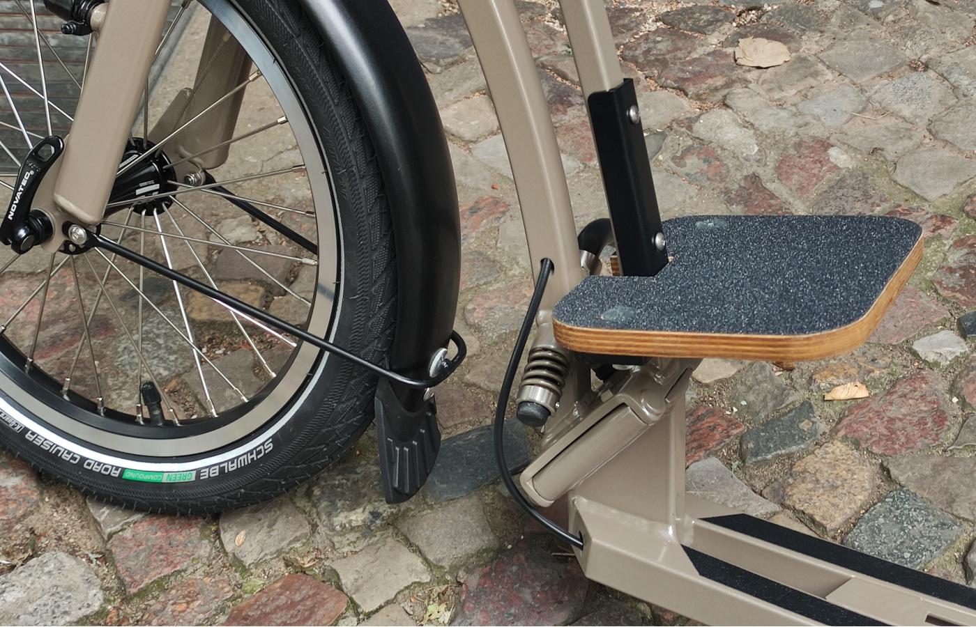 Mit diesem wunderbaren Kindertritt! Kind steht etwas erhöht und kann sich somit gut am Lenker festhalten, während mann/frau genug Platz für die Füße hat, um ohne Einschränkung kicken zu können. Probiert es aus!
