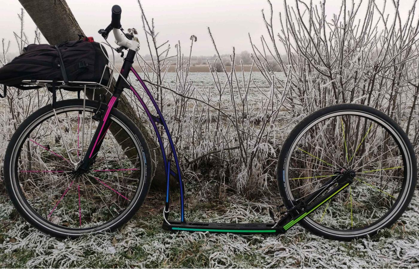 Liebe Leute, diese weiße Märchenlandschaft liegt gleich am nördlichen Stadtrand von Berlin. Es waren also von unserem Kiez aus vielleicht 15 Kilometer mit dem Roller. Und ich kann nur allen, die heute auf dem Rad über kalte Finger klagten, raten, nehmt das nächste Mal ein Footbike! Denn wo der gesamte Körper zum Einsatz kommt, werden auch die Hände gut durchblutet.