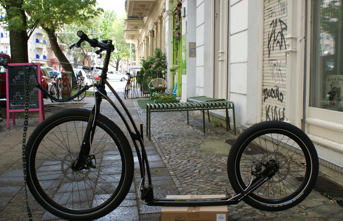 Wenn der Hund mit ganzer Kraft durch freies Gelände ziehen soll. Dann ist, neben Hundeantenne, guten Scheibenbremsen, auch eine größere Lichte Höhe des Trittbretts vom Vorteil. Hier erzielt durch das Aufziehen von SCHWALBE BIG BEN PLUS.