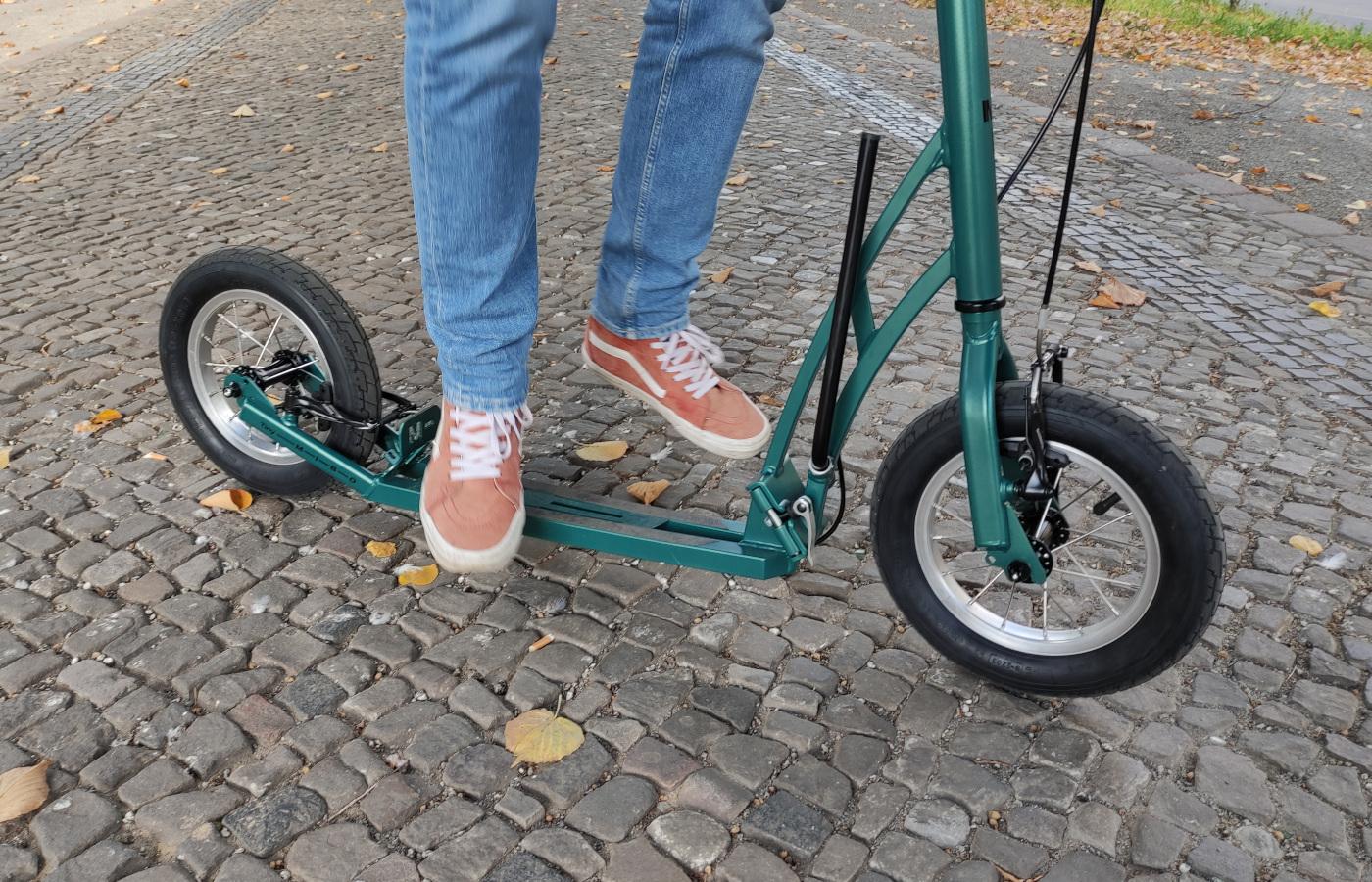 "(...) Als Liebhaber von kleinen agilen Stadtrollern, wie beispielsweise dem Boardy, wartete ich gespannt auf den neuen bzw. wiederaufgelegten und verbesserten Tiny und er enttäuschte nicht! Gleich nach dem ersten Aufsteigen ist es da, dieses Lächeln, aufgrund der erfrischenden Agilität und zügigen Beschleunigung wie kaum bei einem anderen Roller. Der Tiny wirkt auf den ersten Blick wie die Kinderausgabe des Mastr mit 16 Zoll Rädern. Im Grunde wurden beim Tiny nur die Räder auf 12 Zoll geschrumpft und der Rahmen entsprechend angepasst. Der Radstand verkürzte sich dadurch nur um 7 cm, die Gesamtlänge aber um ganze 19 cm, was den Tiny um einiges kompakter als den Mastr macht. Ein großer Vorteil, wenn man ihn in Verbindung mit öffentlichen Verkehrsmitteln ungefaltet einsetzt.